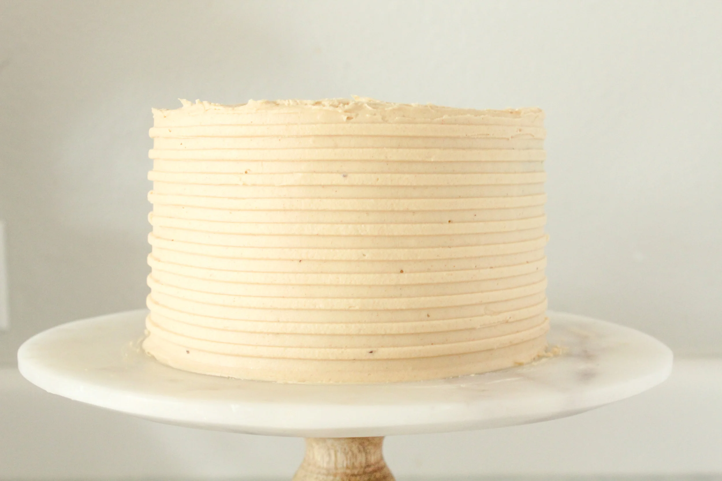 - Once the frosting is hard to the touch on the cake, remove from the refrigerator and frost the entire cake and use the cake smoother to create the ridges if desired.